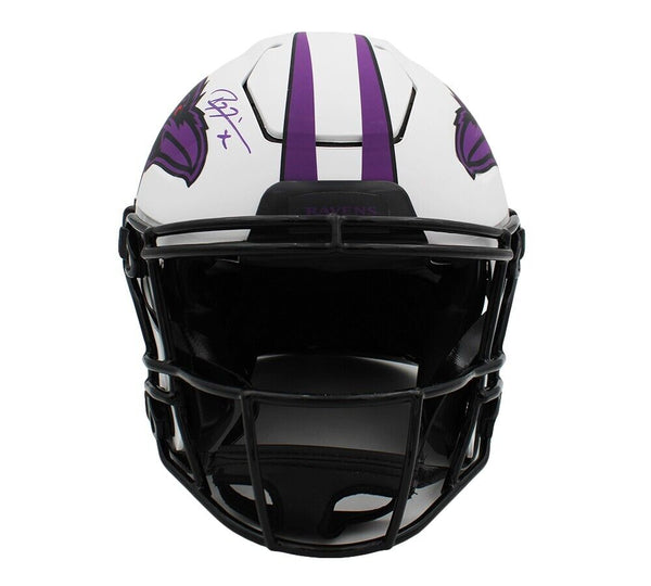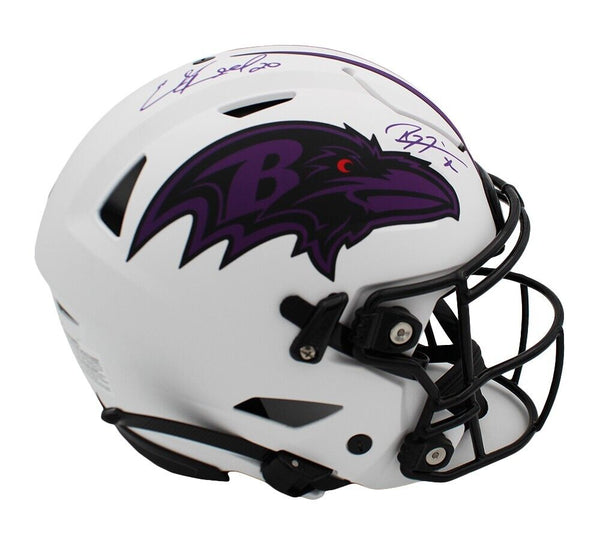 A Baltimore Ravens Speed Flex Lunar NFL Helmet hand signed by Ed Reed and Ray Lewis. The item and signature are in excellent condition. Ed is a 5x first team All-Pro, and a 9x Pro Bowler. Ray is a Super Bowl MVP in the, and a 2x NFL Defensive Player of Year. AUTHENTICATION: The item is accompanied by a Certificate of Authenticity - Serial Numbered and Databased Hologram - Picture of Ed and Ray from their Signing