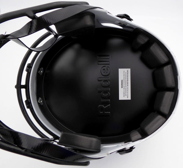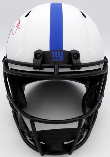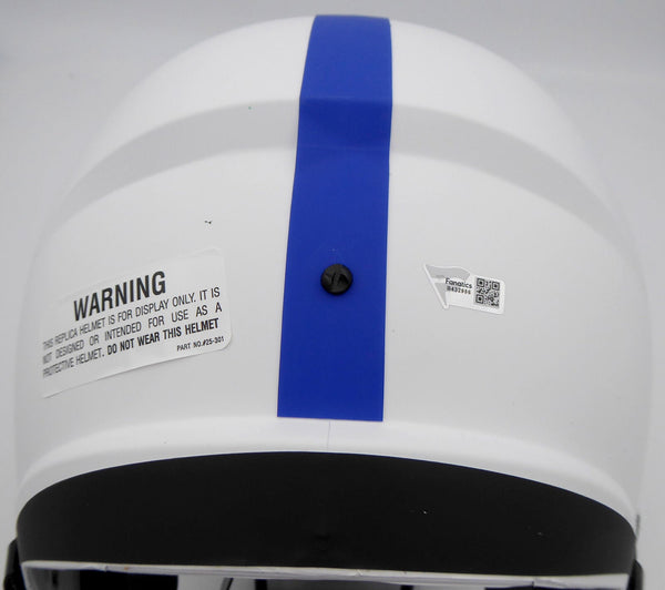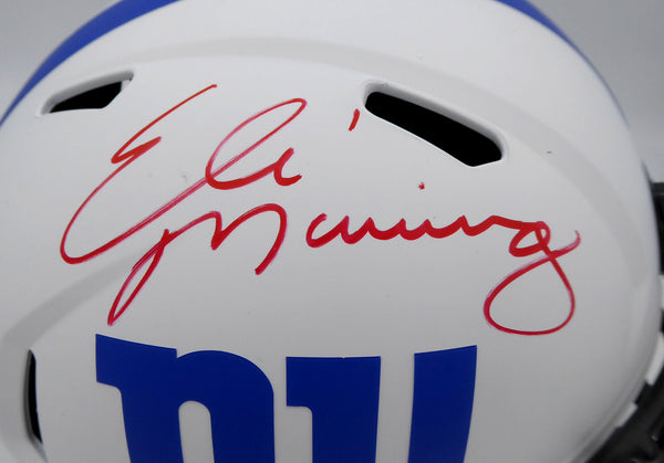 This is a New York Giants Lunar Eclipse White Full Size Replica Speed Helmet that has been hand signed by Eli Manning. The Eclipse helmets are very delicate and often have some marks or scratches on them. This item has been certified authentic by Fanatics and comes with their tamper-proof sticker.A NOTE:A There is a small mark by the autograph, as shown in the pictures.