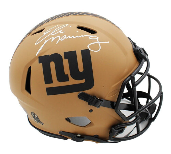 A New York Giants Speed Authentic Salute to Service 2 NFL Helmet hand signed by Eli Manning. The item and signature are in excellent condition. Eli is a former quarterback who played in the NFL for 16 seasons with the New York Giants. After playing college football at the University of Mississippi, he was selected as the first overall pick in the 2004 NFL Draft by the San Diego Chargers and traded to the Giants during the draft. AUTHENTICATION: The item is tagged with Fanatics Authentic Serial Numbered and Databased Hologram