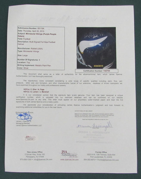 CARL ELLER - ALAN PAGE- JIM MARSHALL- GARY LARSEN - "PURPLE PEOPLE EATERS" HAND PAINTED MINNESOTA VIKINGS HELMET W/ CUSTOM THROWBACK FACE MASK. Minnesota Vikings Hand Painted "ONE OF A KIND" Riddell Helmet w/ custom gray facemask to replicate the Vikings style of helmet from the 1960`s & 70`s. The "Purple People Eaters" nickname was given to the defensive line of the Vikings from 1967-1977 consisting of Hall of Famers Alan Page and Carl Eller along with Jim Marshall and Gary Larsen. These autographs have been certified by James Spence Authentication , the foremost autograph authentication company in the world and comes with their letter of authenticity.