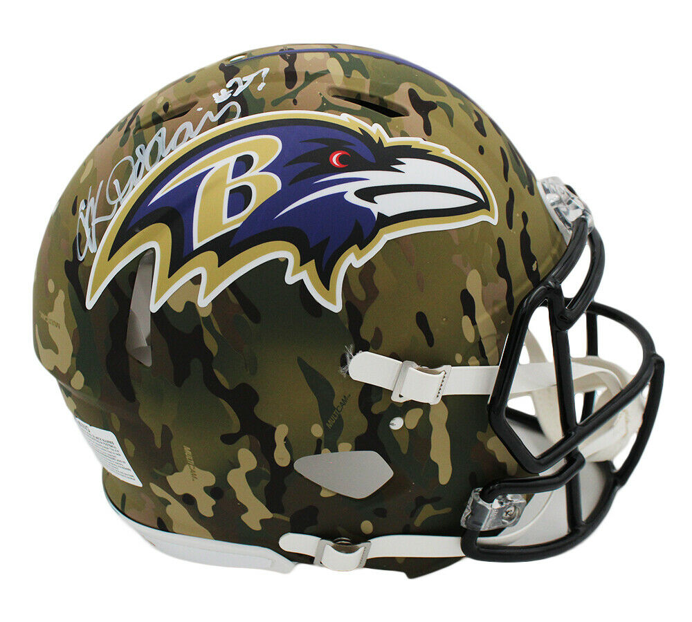 A Baltimore Ravens Speed Authentic Camo NFL Helmet hand signed by J.K. Dobbins. The item and signature are in excellent condition. J.K. Dobbins is a football running back. He played college football at Ohio State before being drafted in the 2020 NFL Draft by the Baltimore Ravens. He was 2017 Big-10 Championship Game MVP & received the Earl Campbell Tyler Rose award. AUTHENTICATION: The item is accompanied by a JSA Certificate of Authenticity - JSA Serial Numbered and Databased Hologram