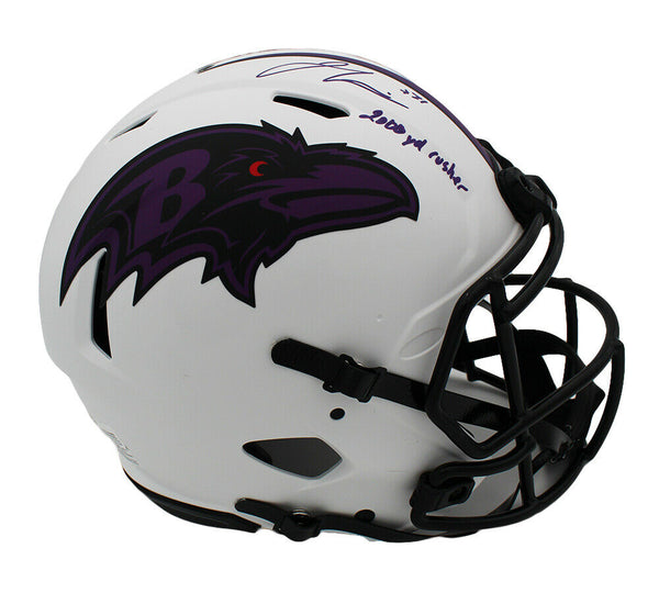 A Baltimore Ravens Speed Authentic Lunar NFL Helmet hand signed by Jamal Lewis. The item and signature are in excellent condition. In addition to signing his name, Jamal also inscribed "2000 Yd Rusher" on the item. Jamal Lewis is a football running back. He played college football for the Tennessee Volunteers before being drafted by the Baltimore Ravens in the 1st round, 5th overall, in the 2000 NFL Draft. He is a Super Bowl Champ. In 2003 he was selected for the Pro Bowl, First Team All-Pro, NFL Offensive Player of the year and NFL Rushing Yards Leader of the year. AUTHENTICATION: The item is accompanied by a Certificate of Authenticity - Serial Numbered and Databased Hologram - Picture of Jamal from the Signing -