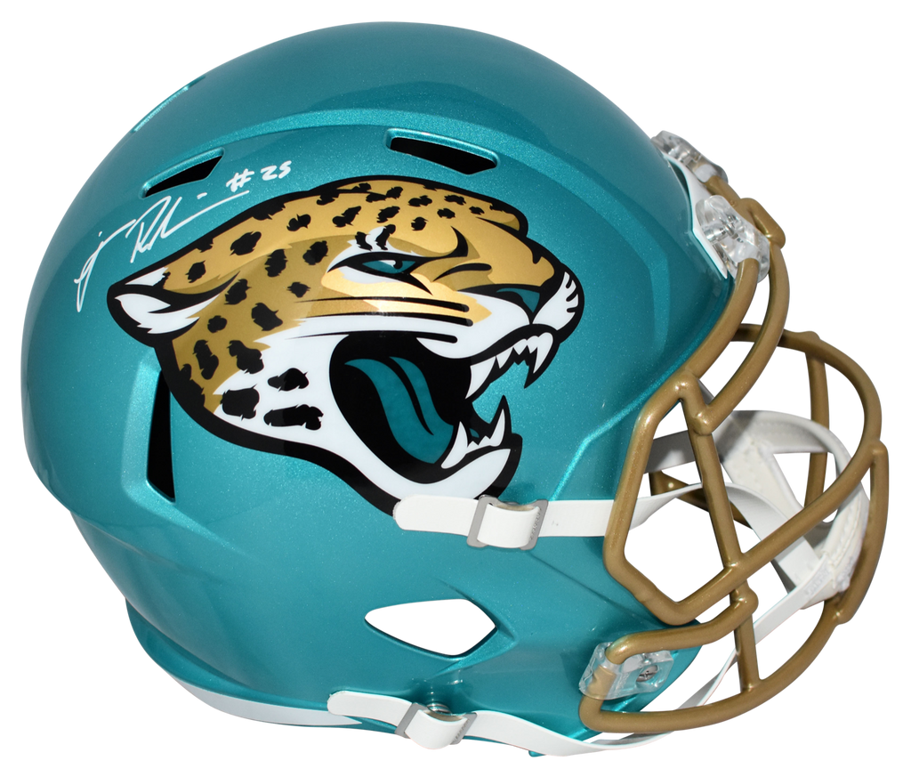 James Robinson, former running back for the Jacksonville Jaguars, has hand signed this Jaguars Riddell Speed Flash full-size replica helmet at a private signing. This item is authenticated by Beckett Authentication Services, one of the best authenticators in the industry. Their tamper-evident hologram featuring a QR code and serial number is on the item. The authenticity can be verified online by entering the serial number or scanning the QR code.Item pictured may not be the exact item you will receive. It will be similar quality, and we guarantee your satisfaction.