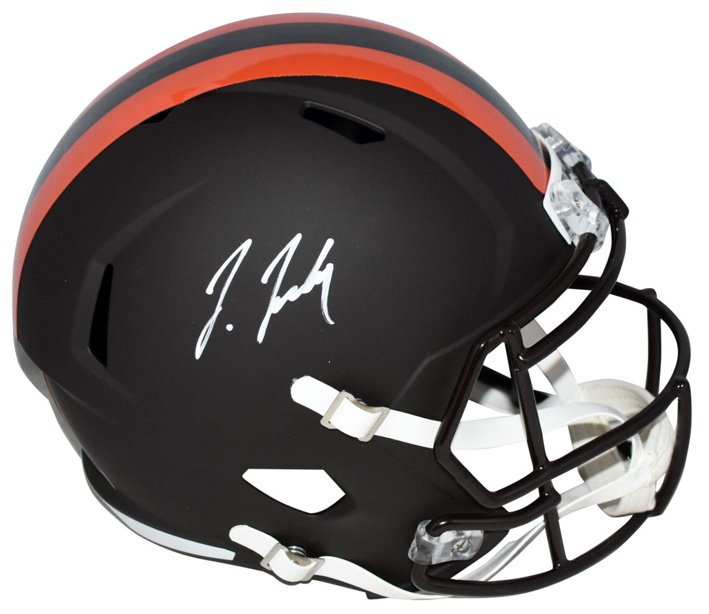 Jerry Jeudy, star wide receiver for the Cleveland Browns, has hand signed this Browns 2025 Alternate Riddell Speed full-size replica helmet at a private signing. This item is authenticated by Beckett Authentication Services and was signed in the presence of one of their representatives. Their tamper-evident hologram featuring a QR code and serial number is on the item. The authenticity can be verified online by entering the serial number or scanning the QR code.Item pictured may not be the exact item you will receive. It will be similar quality, and we guarantee your satisfaction.