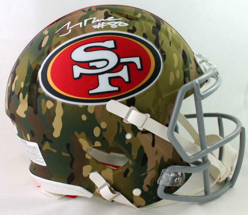 Jerry Rice Autographed San Francisco 49ers F/S Camo Speed Authentic Helmet - Beckett W Auth *White This is a hand autograph of Jerry Rice of the San Francisco on a Riddell Football Full Size Camo Speed Authentic Helmet. This item has a Beckett Witnessed Authentication, which comes with a numbered and a matching Beckett Certificate of Authenticity. You can view this item on the Beckett Authentication website and it shows when and where the item was signed. It was signed either at a public autograph appearance or a private signing. This is a stock photo of the item. Although you may not receive this exact item, the item you receive is virtually identical and brand new in great shape.