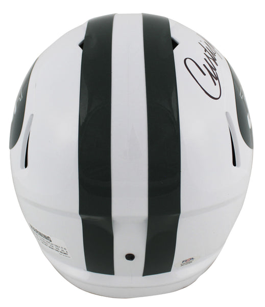 This Autographed 1998-2018 Throwback Full Size Speed Rep Helmet has been Personally Signed by Curtis Martin of the New York Jets. This item is 100% Authentic and comes with a PSA/DNA Certification Card and a matching numbered Hologram. This is a PSA in the Presence Authenticated item which means a PSA representative was present when this item was being signed. We conducted an autograph signing with Curtis Martin where multiples of the same item were signed. While the photographs are representative of this item, the size, placement and strength of the signature may vary. Each item is hand signed, therefore, each autograph is unique. This item can be verified through PSA/DNA Itp.