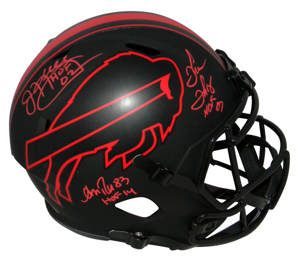 This Buffalo Bills Riddell Speed Eclipse full-size replica helmet has been signed by 3 Bills Hall of Famers; Jim Kelly, Thurman Thomas and Andre Reed. Each player included his HOF inscription. This item comes with a certificate of authenticity (COA) from JSA - James Spence Authentication and was signed in the presence of one of their representatives. You will receive a serial-numbered COA along with a matching serial-numbered sticker on the helmet. The authenticity can be verified online by entering the serial number.Item pictured may not be the exact item you will receive. It will be similar quality, and we guarantee your satisfaction.