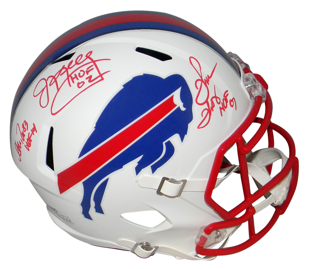 This Buffalo Bills Riddell Speed Flat White full-size replica helmet has been signed by 3 Bills Hall of Famers; Jim Kelly, Thurman Thomas and Andre Reed. Each player included his HOF inscription. This item comes with a certificate of authenticity (COA) from JSA - James Spence Authentication and was signed in the presence of one of their representatives. You will receive a serial-numbered COA along with a matching serial-numbered sticker on the helmet. The authenticity can be verified online by entering the serial number.Item pictured may not be the exact item you will receive. It will be similar quality, and we guarantee your satisfaction.