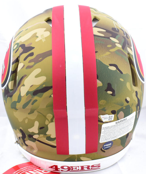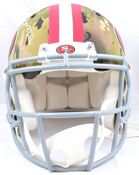 Joe Montana Jerry Rice Autographed San Francisco 49ers F/S Camo Speed Authentic Helmet - Fanatics *White This is a hand autograph of Joe Montana and Jerry Rice of the San Francisco 49ers on a Riddell Football Full Size Camo Speed Authentic Helmet. This item has a Fanatics Authentication, which comes with a numbered sticker hologram and a QR code for verification. You can view this item on the Fanatics Authentication website and it shows the item was signed. It was signed either at a public autograph appearance or a private signing. This is a stock photo of the item. Although you may not receive this exact item, the item you receive is virtually identical and brand new in great shape.