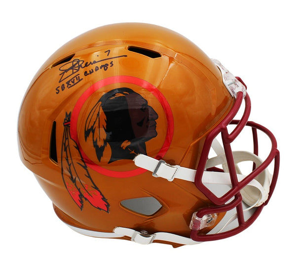 A Washington Redskins Speed Replica Flash Custom Decal NFL Helmet hand signed by Joe Theismann. The item and signature are in excellent condition. In addition to signing his name, Joe also inscribed "SB XVII Champs" on the item. Joe Theismann is a former NFL Quarterback. He played 12 seasons with the Washington Commanders. He is a Super Bowl XVII Champion, 1983 NFL MVP, 2x Pro Bowler, 1983 NFL Offensive Player of the Year. AUTHENTICATION: The item is accompanied by a JSA Certificate of Authenticity - JSA Serial Numbered and Databased Hologram