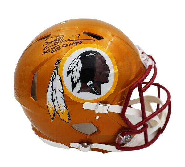 A Washington Commanders Speed Authentic Flash NFL Helmet hand signed by Joe Theismann. The item and signature are in excellent condition. In addition to signing his name, Joe also inscribed "SB XVII Champs" on the item. Joe Theismann is a former NFL Quarterback. He played 12 seasons with the Washington Commanders. He is a Super Bowl XVII Champion, 1983 NFL MVP, 2x Pro Bowler, 1983 NFL Offensive Player of the Year. AUTHENTICATION: The item is accompanied by a JSA Certificate of Authenticity - JSA Serial Numbered and Databased Hologram