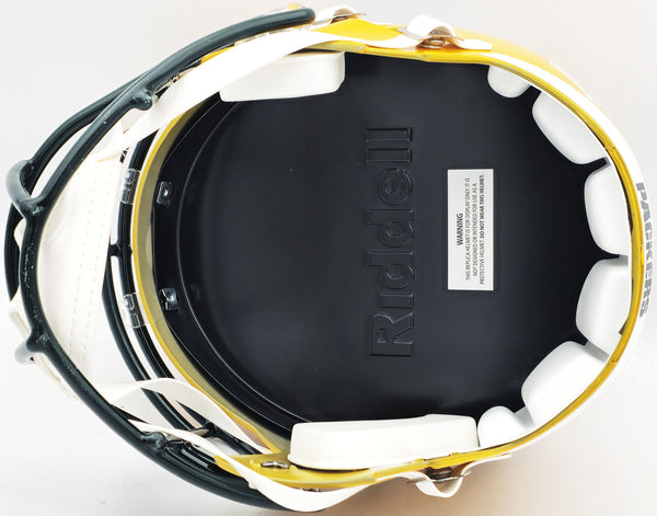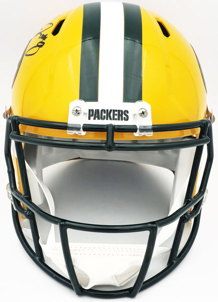 This is a Green Bay Packers Yellow Full Size Speed replica Helmet that has been hand signed by Josh Jacobs. This item has been witnessed and certified authentic by Beckett Authentication (BAS) and comes with their tamper-proof witness sticker.