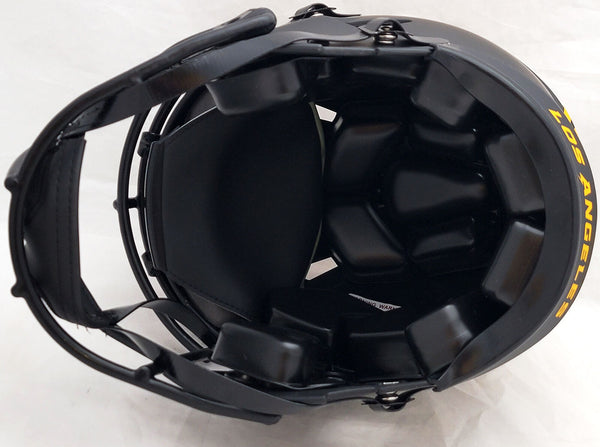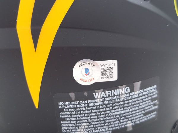 This is a Los Angeles Chargers Eclipse Black Full Size Authentic Speed Helmet that has been hand signed by Justin Herbert. Please note, there are scuffs on this item as pictured. This item was inscribed "2020 NFL Rookie Of The Year." This item has been witnessed and certified authentic by Beckett Authentication (BAS) and comes with their tamper-proof witness sticker. Beckett Authentication has recently changed their physical certificate card policy where they no longer match their tamper-proof sticker with a physical certificate. The tamper-proof sticker holds the value in the authentication process while the certificate does not. A certificate can be printed on Beckett's website for the matching authentication number.