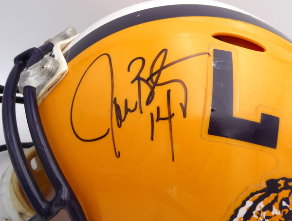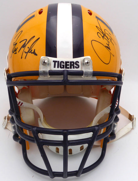 This is a Full Size Authentic Helmet that has been hand signed by Les Miles & Josh Booty. This item has been certified authentic by Beckett Authentication (BAS) and comes with their tamper-proof QR Code sticker that can be verified on the Beckett-authentication.com.