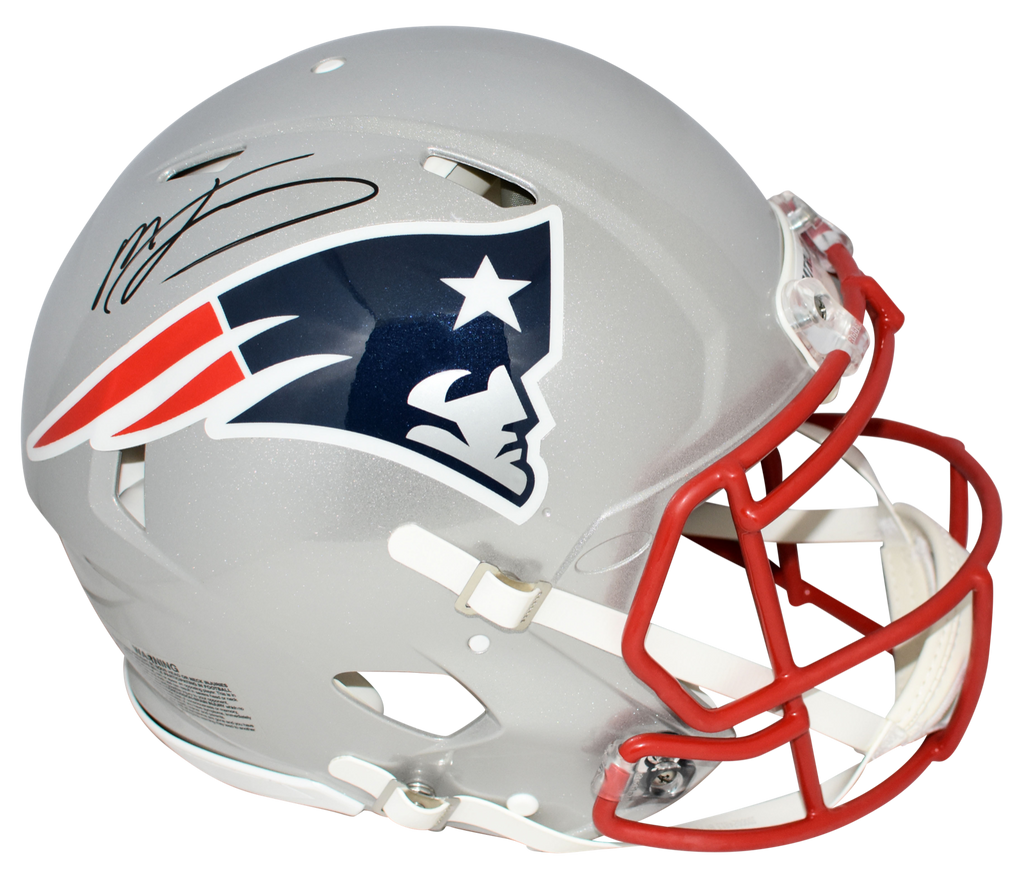 Mac Jones, quarterback for the New England Patriots, has hand signed this Patriots Riddell Speed full-size authentic helmet at a private signing. This helmet is fully padded inside like the ones worn the field. This item is authenticated by Beckett Authentication Services and was signed in the presence of one of their representatives. Their tamper-evident hologram featuring a QR code and serial number is on the item. The authenticity can be verified online by entering the serial number or scanning the QR code.Item pictured may not be the exact item you will receive. It will be similar quality, and we guarantee your satisfaction.