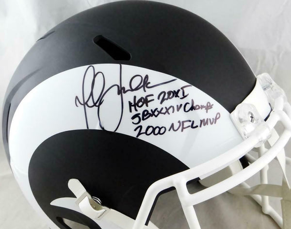 Marshall Faulk Signed LA Rams F/S Flat Black Speed Helmet- Beckett Auth *Black This is a hand autograph of Marshall Faulk of the Los Angeles Rams on a Riddell Football Full Size Speed Flat Black Replica Helmet. This item has a Beckett Authentication, which comes with a Beckett numbered and a matching Beckett Certificate of Authenticity. You can view this item on the Beckett Authentication website and it shows when and where the item was signed. It was signed either at a public autograph appearance or a private signing. This is a stock photo of the item. Although you may not receive this exact item, the item you receive is virtually identical and brand new in great shape.