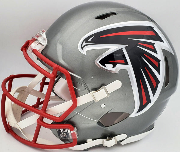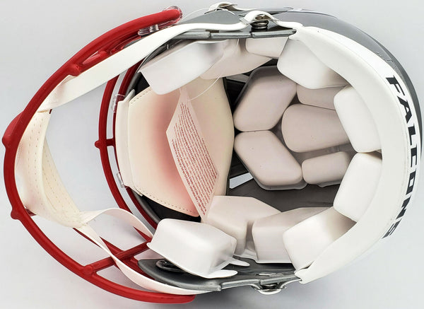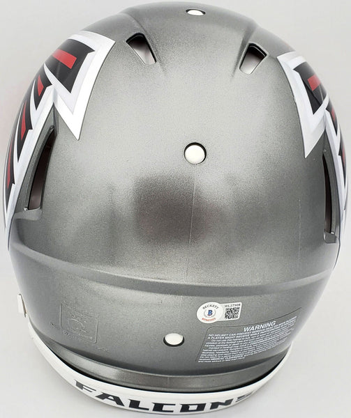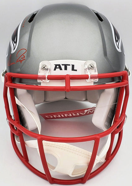 This is an Atlanta Falcons Flash Silver Full Size Authentic Speed Helmet that has been hand signed by Matt Ryan. The Flash helmets are very delicate and often have some marks or scratches on them. This item was inscribed "2016 NFL MVP." This item has been certified authentic by Beckett Authentication (BAS) and comes with their tamper-proof QR Code sticker that can be verified on the Beckett-authentication.com.