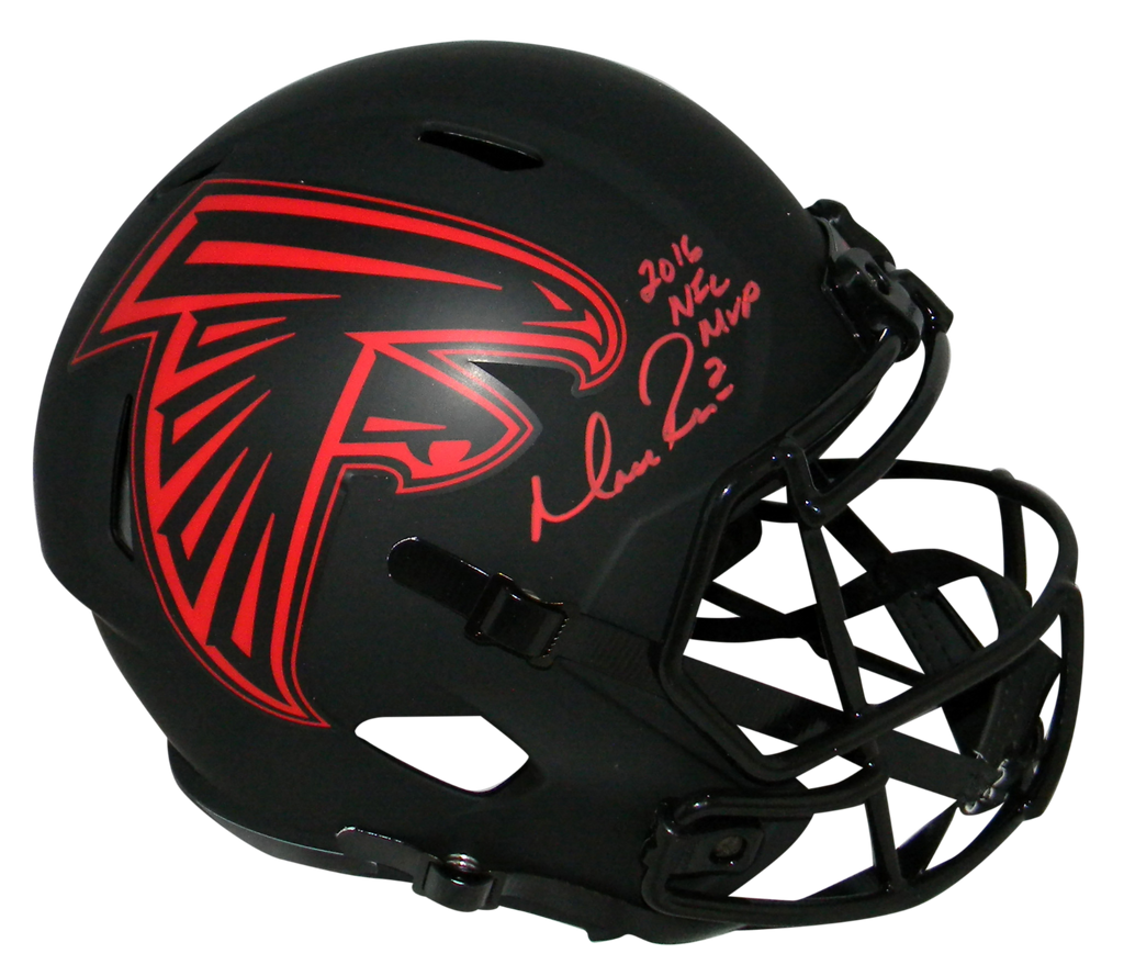 Matt Ryan, star quarterback for the Atlanta Falcons, has hand signed this Falcons Riddell Speed Eclipse full-size replica helmet at a private signing. He included the inscription "2016 NFL MVP". This item comes with a certificate of authenticity (COA) from Beckett Authentication Services and was signed in the presence of one of their representatives. You will receive a serial-numbered COA along with a matching serial-numbered sticker on the helmet. The authenticity can be verified online by entering the serial number.Item pictured may not be the exact item you will receive. It will be similar quality, and we guarantee your satisfaction.