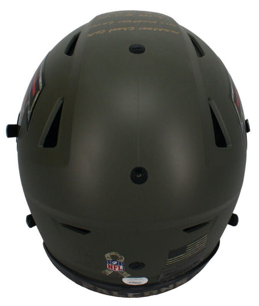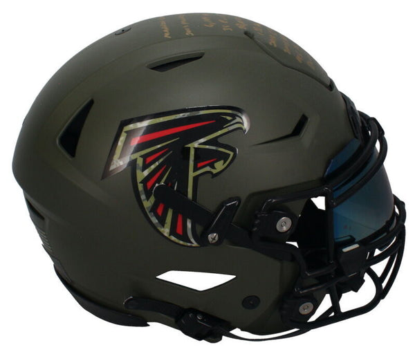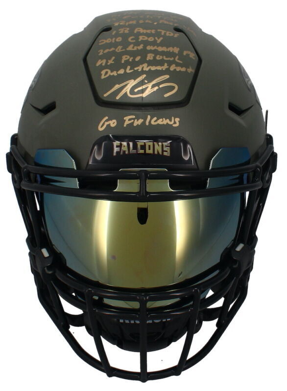Is an atlanta falcons authentic speed flex helmet hand signed by michael vick with tons of extra ink. just look at all the inscriptions vick has added. this is quite possibly a 1/1. this signature was witnessed by a representative from jsa authentication and includes there hologram. made in the usa personally autographed by michael vick includes tamper-evident hologram.