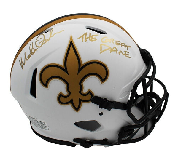 A New Orleans Saints Speed Authentic Lunar NFL Helmet hand signed by Morten Andersen. The item and signature are in excellent condition. In addition to signing his name, Morten also inscribed "THE GREAT DANE" on the item. Morten was drafted into the NFL 1982 Round:4, Pick:86. Morten is a 2x Golden Toe Award winner, a 7x Pro Bowler, 5x First-team All-Pro, and Morten is in the New Orleans Hall of Fame. AUTHENTICATION: The item is accompanied by a Morten Andersen Exclusive Certificate of Authenticity - Morten Andersen Exclusive Serial Numbered and Databased Hologram - Picture of Morten from the signing