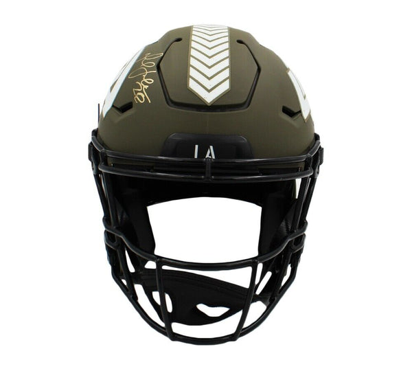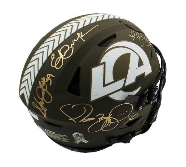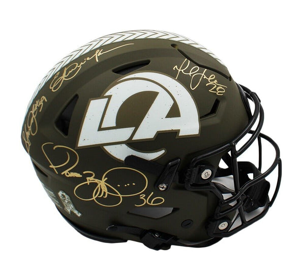 A Los Angeles Rams Speed Flex Authentic Salute to Service NFL Helmet hand signed by Jerome Bettis, Eric Dickerson, Marshall Faulk and Steven Jackson. The item and signatures are in excellent condition. AUTHENTICATION: The item is accompanied by a Certificate of Authenticity - Serial Numbered and Databased Hologram - Pictures of the Steven from the signing