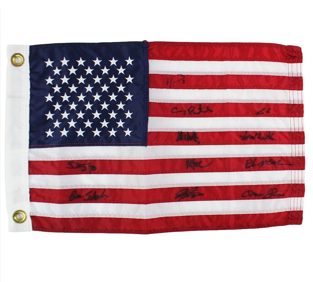 A Miracle on Ice USA Flag hand signed by Mike Eruzione, Craig Patrick, Buzz Schneider, Ken Morrow, Steve Christoff, Steve Janaszak, Eric Strobel, Mark Wells, Rob McClanahan, and Dave Christian. The item and signature are in excellent condition. The 1980 US Olympic Hockey Team shocked the world by defeating the heavily favored Soviet Union 4-3 in the "Miracle On Ice" and went on to win the gold medal by beating Finland, a triumph widely regarded as one of the greatest moments in sports history. AUTHENTICATION: The item is accompanied by a JSA Certificate of Authenticity - JSA Serial Numbered Hologram -