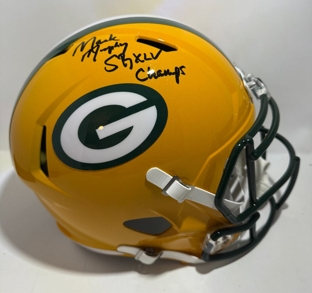 Riddell full size Replica Speed Helmet hand signed by former Green Bay Packers President MARK MURPHY. The signature is in Black Sharpie and includes the inscription "SB XLV Champs". This item was signed at a private signing and would make a great addition to any Packers collection! This item is guaranteed to be 100% authentic and will include a COA from from JSA authentication.