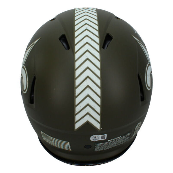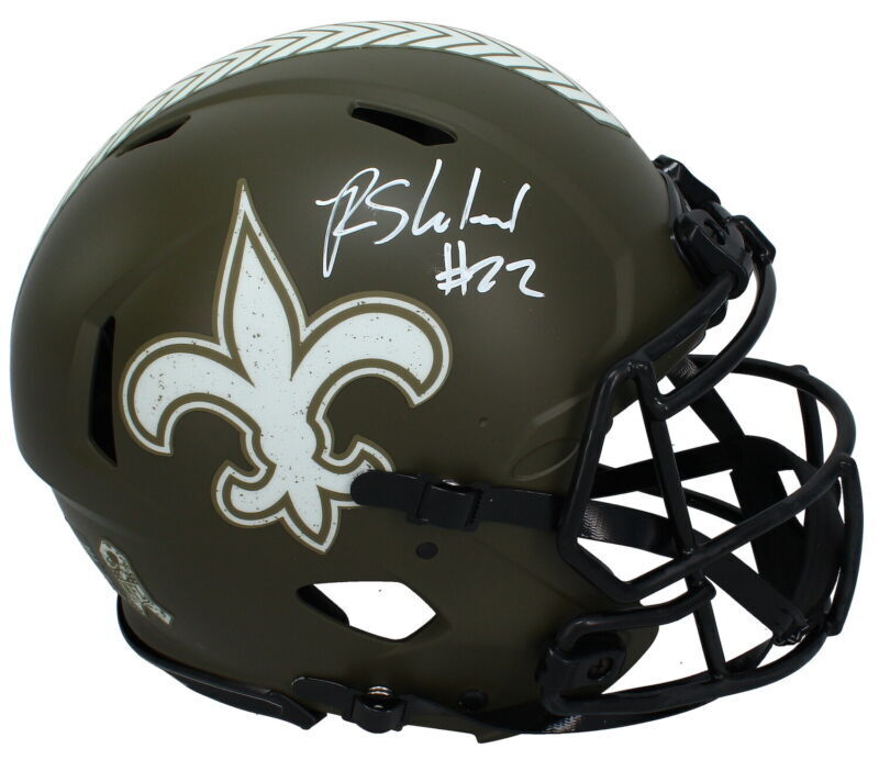 This New Orleans Saints 2022 Salute To Service authentic Riddell Speed helmet has been personally hand-signed by Rashid Shaheed. It comes with an individually numbered, tamper-evident hologram from Beckett Authentic. To ensure authenticity, the hologram can be reviewed online. This process helps to ensure that the product purchased is authentic and eliminates any possibility of duplication or fraud.Rashid Shaheed signs exclusively for Super Sports Center.