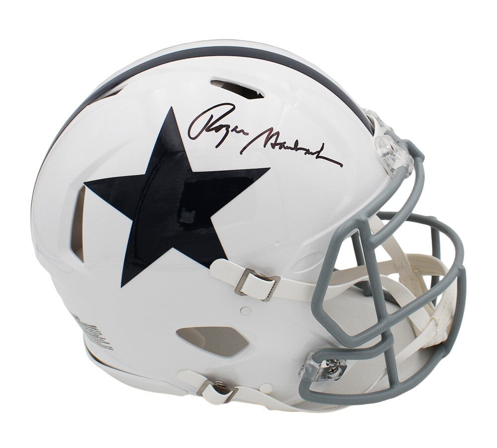 A Dallas Cowboys Speed Authentic Throwback 1960-63 NFL Helmet hand signed by Roger Staubach. The item and signature are in excellent condition. Roger is a 2x Super Bowl Champion, Super Bowl MVP and a 6x Pro Bowler. AUTHENTICATION: The item is accompanied by a Beckett Serial Numbered & Databased Hologram