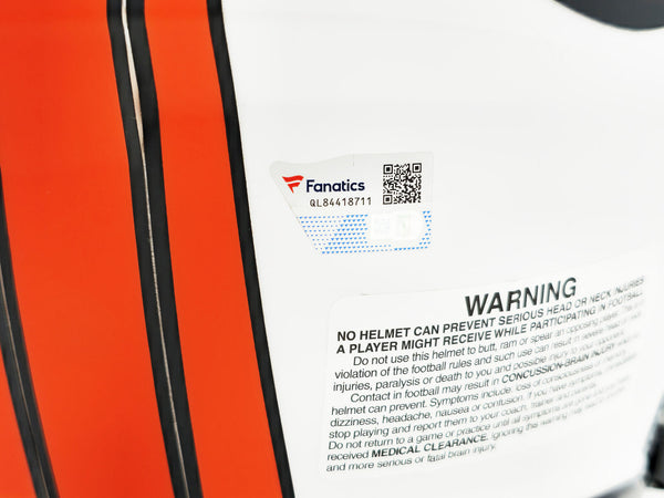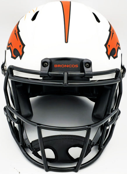 This is a Denver Broncos Lunar Eclipse White Full Size Authentic Speed Helmet that has been hand signed by Russell Wilson. The Eclipse helmets are delicate and may have some marks or scratches on them. This item has been certified authentic by Fanatics and comes with their tamper-proof sticker.