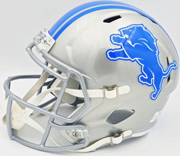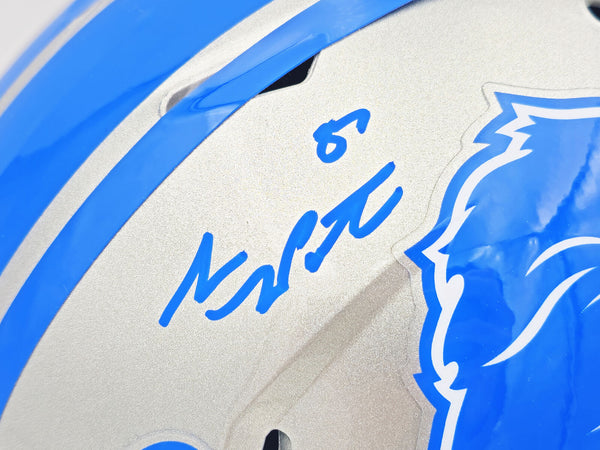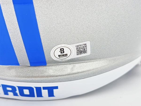 This is a Detroit Lions Silver Full Size Replica Speed Helmet that has been hand signed by Sam LaPorta. This item has been witnessed and certified authentic by Beckett Authentication (BAS) and comes with their tamper-proof witness sticker.
