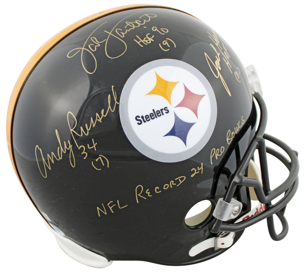 This Autographed Full Size Rep Helmet with the inscription of "HOF 90 (9) (Lambert), HOF 88 (8) (Ham) & (7) NFL Record 24 Pro Bowls (Russell)" has been Personally Signed by Jack Lambert, Jack Ham & Andy Russell of the Pittsburgh Steelers. This item is 100% Authentic and comes with a PSA/DNA Certification Card and a matching numbered Hologram. This is a PSA in the Presence Authenticated item which means a PSA representative was present when this item was being signed. The authenticity can be verified on Professional Sports Authenticator website.