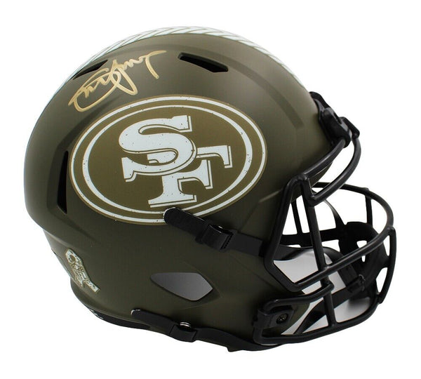 A San Francisco 49ers Speed Replica Salute To Service NFL Helmet hand signed by Steve Young. The item and signature are in excellent condition. Steve is a 3x Super Bowl Champion, 7x Pro Bowler, and is a member of the College Football Hall of Fame and the Pro Football Hall of Fame. AUTHENTICATION: Your item is tagged with a SmarTag powered by Prova Technology, which gives you digital access to your items authentication records, which includes a proof picture from the signing.