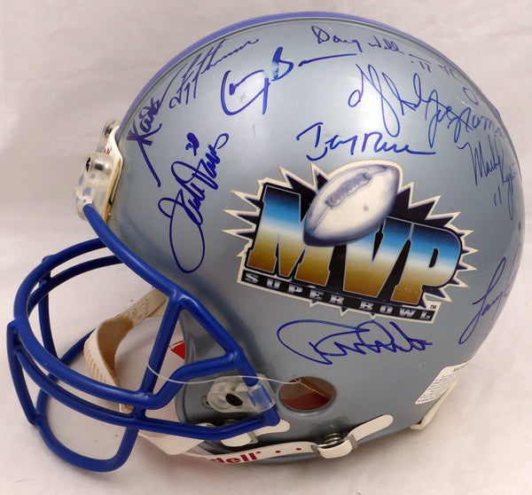 This is an Authentic Full Size Helmet that has been hand signed by 27 Super Bowl MVP's. Signatures include Bart Starr, Joe Montana, Joe Namath, Jerry Rice, Harvey Martin, Troy Aikman, Terry Bradshaw, John Elway, Roger Staubach, Len Dawson, Fred Biletnikoff, Larry Csonka, Franco Harris, Terrell Davis, Marcus Allen, Randy White, Desmond Howard, Chuck Howley, Phil Simms, Richard Dent, Jim Plunkett, Emmitt Smith, Lynn Swann, Larry Brown, Ottis Anderson, Mark Rypien and Doug Williams. This item has been certified authentic by Beckett Authentication (BAS) and comes with their tamper-proof sticker and matching full-page certificate of authenticity.A NOTE: Some of the autographs have minor smudges, as shown in the pictures.