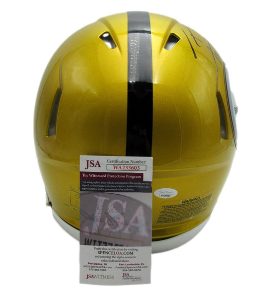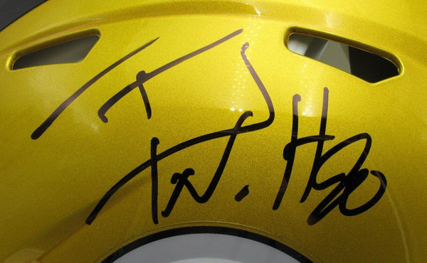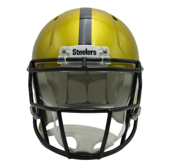 T.J. Watt Autographed Gold Full Size Flash Authentic Football Helmet Pittsburgh Steelers. This helmet is authenticated by JSA and includes their tamper-proof hologram sticker and Certificate of Authenticity.