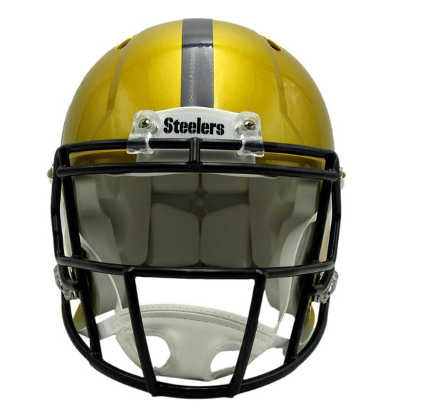 T.J. Watt Autographed Gold Full Size Flash Authentic Football Helmet Pittsburgh Steelers. This helmet is authenticated by JSA and includes their tamper-proof hologram sticker and Certificate of Authenticity.