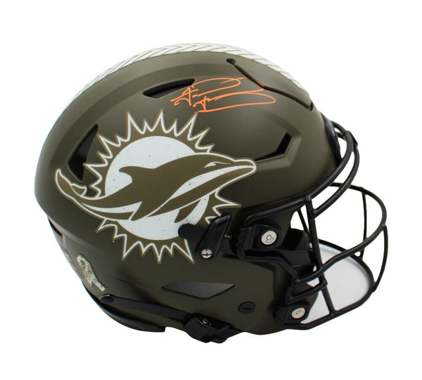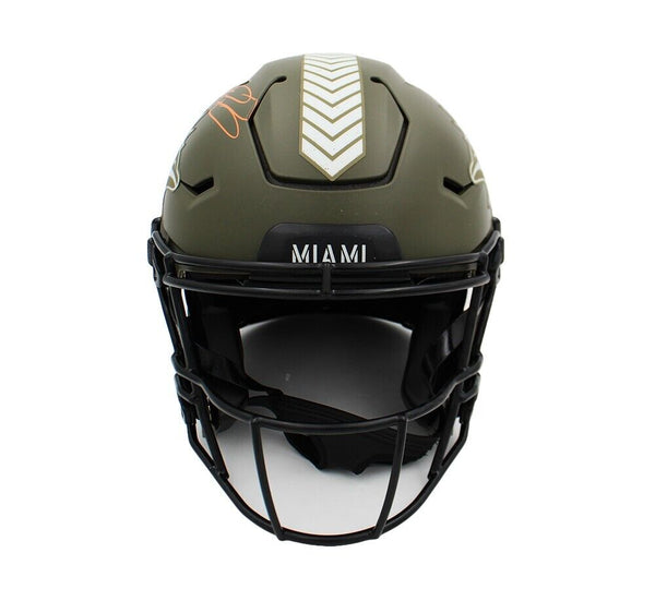 A Miami Dolphins Speed Flex Authentic Salute to Service NFL Helmet hand signed by Tua Tagovailoa and Jaylen Waddle. The item and signature are in excellent condition. AUTHENTICATION: The item is accompanied by a Fanatics Authentic Serial Numbered and Databased Hologram