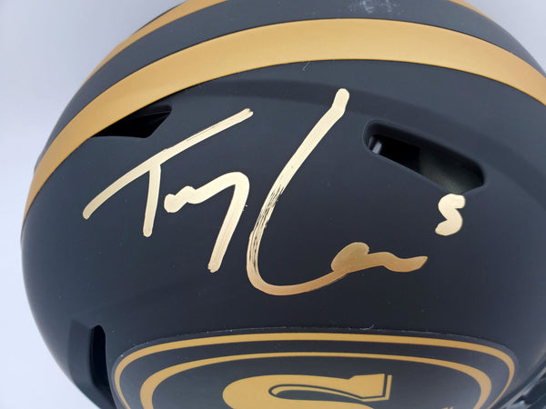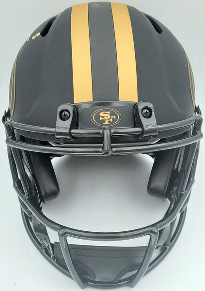 This is a San Francisco 49ers Eclipse Black Full Size Authentic Speed Helmet that has been hand signed by Trey Lance. The Eclipse helmets are very delicate and often have some marks or scratches on them. This item has been certified authentic by Beckett Authentication (BAS) and comes with their tamper-proof QR Code sticker that can be verified on the Beckett-authentication.com.