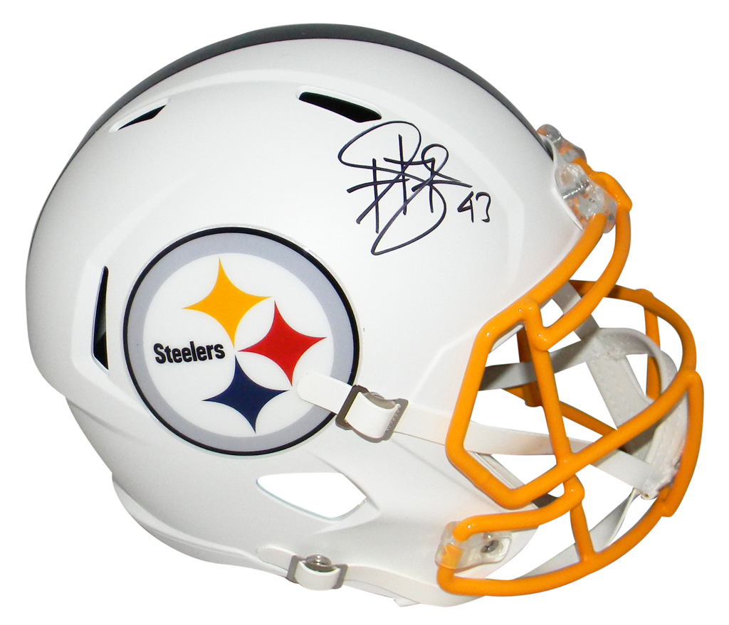 Troy Polamalu, former Hall of Fame safety for the Pittsburgh Steelers, has hand signed this Steelers Riddell Speed Flat White full-size replica helmet at a private signing. This item comes with a certificate of authenticity (COA) from Beckett Authentication Services and was signed in the presence of one of their representatives. You will receive a serial-numbered COA along with a matching serial-numbered sticker on the helmet. The authenticity can be verified online by entering the serial number.Item pictured may not be the exact item you will receive. It will be similar quality, and we guarantee your satisfaction.