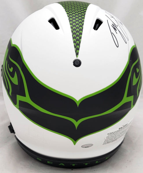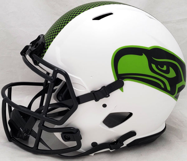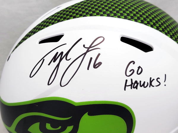 This is a Seattle Seahawks Lunar Eclipse White Full Size Authentic Speed Helmet that has been hand signed by Tyler Lockett. The Eclipse helmets are delicate and may have some marks or scratches on them. This item was inscribed "Go Hawks." This item was signed in the presence of a Mill Creek Sports representative and comes with their serial numbered hologram and matching certificate of authenticity.