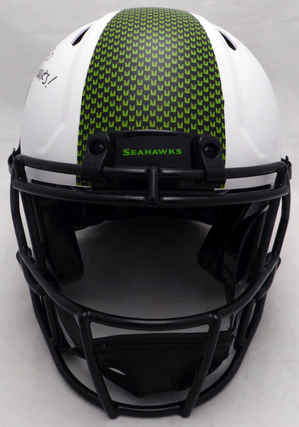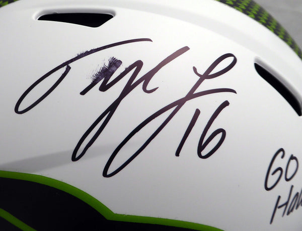 This is a Seattle Seahawks Lunar Eclipse White Full Size Authentic Speed Helmet that has been hand signed by Tyler Lockett. The Eclipse helmets are very delicate and often have some marks or scratches on them. This item was signed in the presence of a Mill Creek Sports representative and comes with their serial numbered hologram and matching certificate of authenticity. NOTE: The signature is smudged, as shown in the pictures.