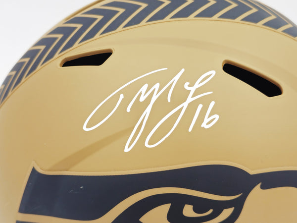 This is a Seattle Seahawks Camo Brown 2023 Salute to Service Full Size Speed Replica Helmet that has been hand signed by Tyler Lockett. Because each Camo helmet is hand-dipped using water-transfer technology there may be slight imperfections. This item was signed in the presence of a Mill Creek Sports representative and comes with their serial numbered hologram and matching certificate of authenticity.