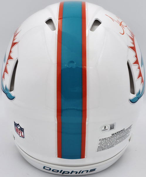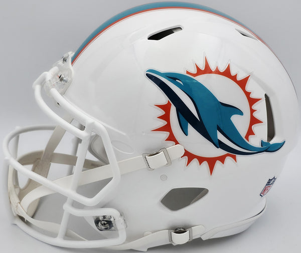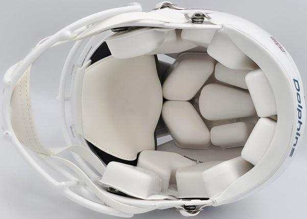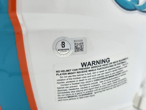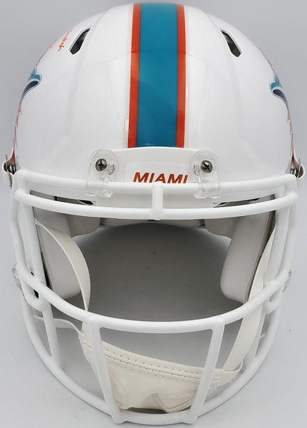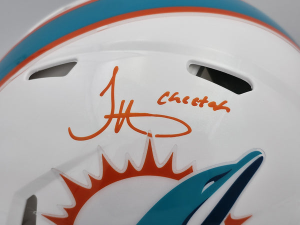 This is a Miami Dolphins White Full Size Authentic Speed Helmet that has been hand signed by Tyreek Hill. This item was inscribed "Cheetah." This item has been certified authentic by Beckett Authentication (BAS) and comes with their tamper-proof hologram.