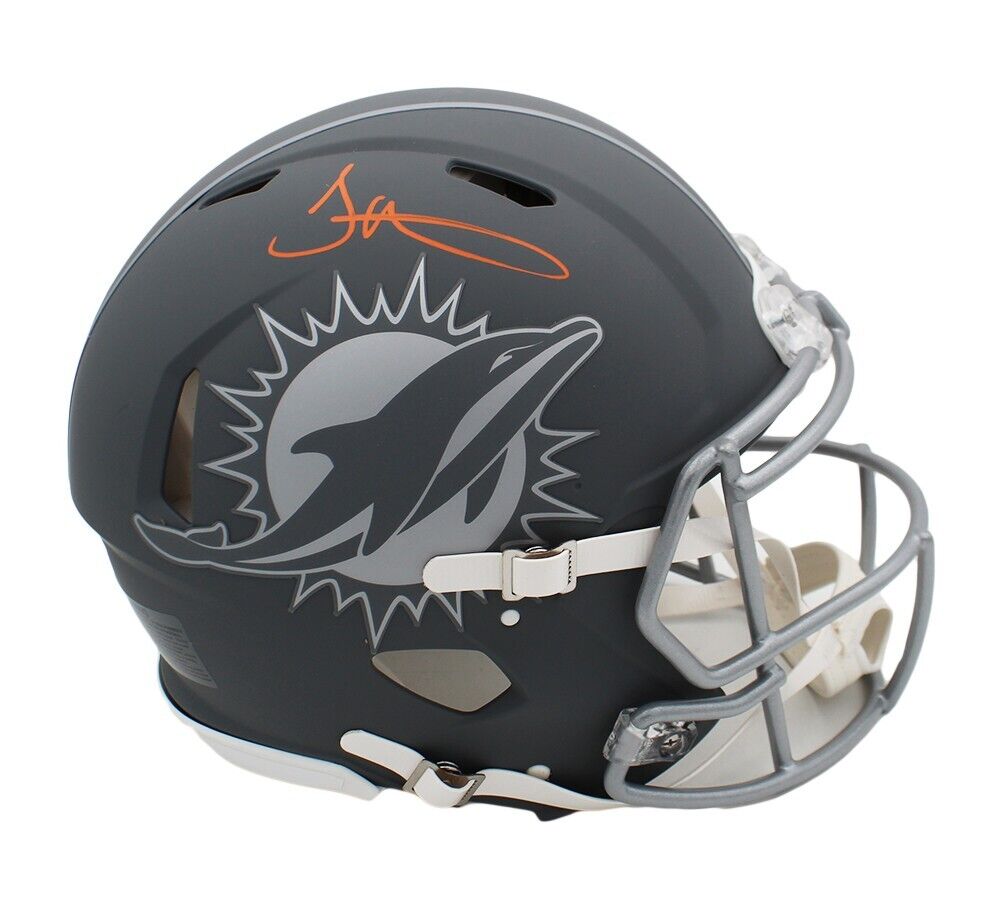 A Miami Dolphins Speed Authentic Slate NFL Helmet hand signed by Tyreek Hill. The item and signature are in excellent condition. Tyreek is a successful wide receiver in the NFL. Hill was drafted by the Kansas City Chiefs in the fifth round of the 2016 NFL draft. He played college football at Garden City, Oklahoma State, and West Alabama. He is a Super Bowl Champion (LIV), 5x NFL All-Pro, and 8x Pro Bowl selection. AUTHENTICATION: The item is accompanied by a Beckett Serial Numbered and Databased Hologram