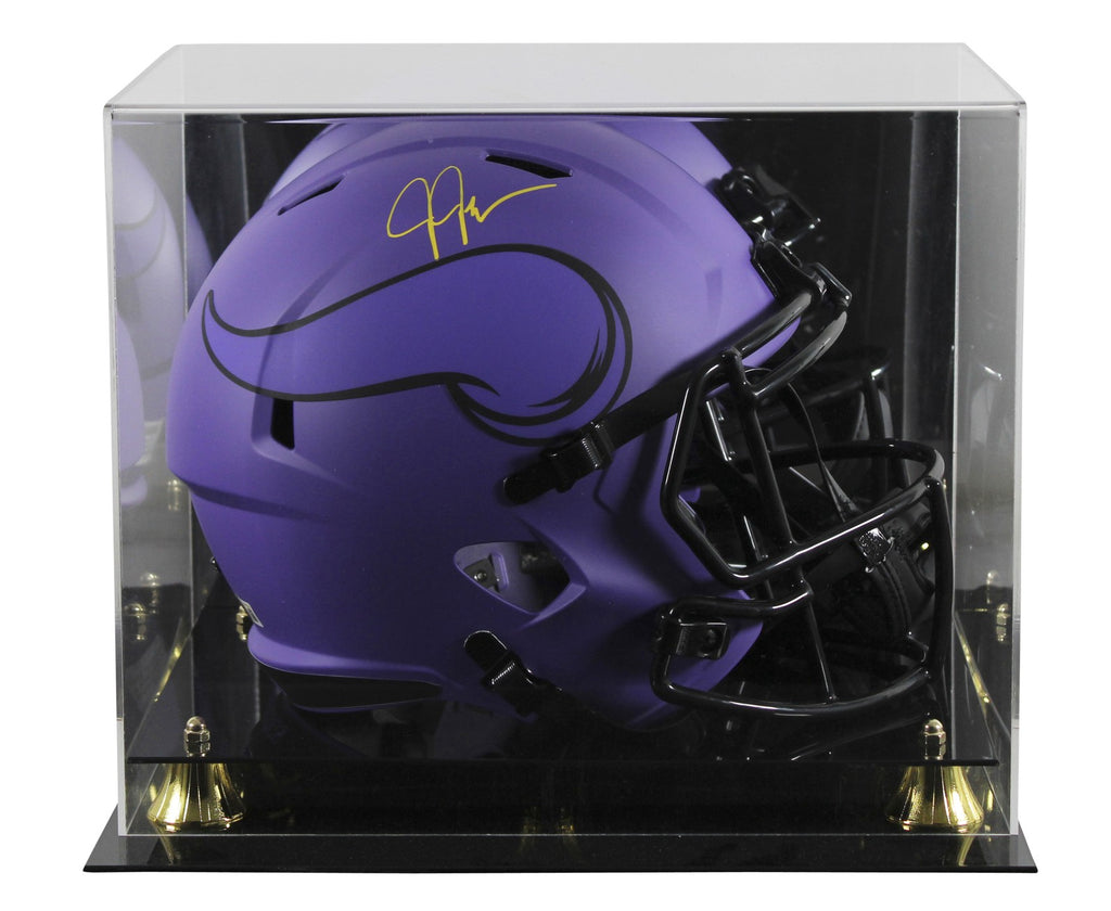 This Autographed Alternate Rave Riddell Full Size Speed Rep Helmet W/ Uv Mirrored Back Acrylic Display Case has been Personally Signed by Justin Jefferson of the Minnesota Vikings. This item is 100% Authentic to include a hologram by Beckett Authentication Services. This item will come with an affixed Beckett Authentication Services (BAS) authentication sticker, which includes a scannable QR code to verify authenticity. Please note that Beckett no longer provides serial-numbered COA cards, and the attached BAS sticker will serve as the complete authentication for this item. This is a BAS Witnessed Protection Program item which means a Beckett Authentication Service representative was present when this item was being signed. We conducted an autograph signing with Justin Jefferson where multiples of the same item were signed. While the photographs are representative of this item, the size, placement and strength of the signature may vary. Each item is hand signed, therefore, each autograph is unique. This item can be verified through BAS Witnessed.
