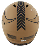 This Autographed Alternate 2023 Salute To Service II Riddell Full Size Speed Rep Helmet has been Personally Signed by T.J. Hockenson of the Minnesota Vikings. This item is 100% Authentic to include a hologram by Beckett Authentication Services. This item will come with an affixed Beckett Authentication Services (BAS) authentication sticker, which includes a scannable QR code to verify authenticity. Please note that Beckett no longer provides serial-numbered COA cards, and the attached BAS sticker will serve as the complete authentication for this item. This is a BAS Witnessed Protection Program item which means a Beckett Authentication Service representative was present when this item was being signed. We conducted an autograph signing with T.J. Hockenson where multiples of the same item were signed. While the photographs are representative of this item, the size, placement and strength of the signature may vary. Each item is hand signed, therefore, each autograph is unique. This item can be verified through BAS Witnessed.
