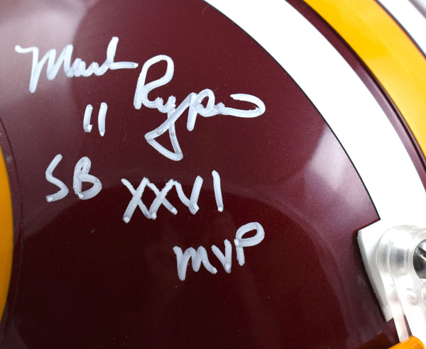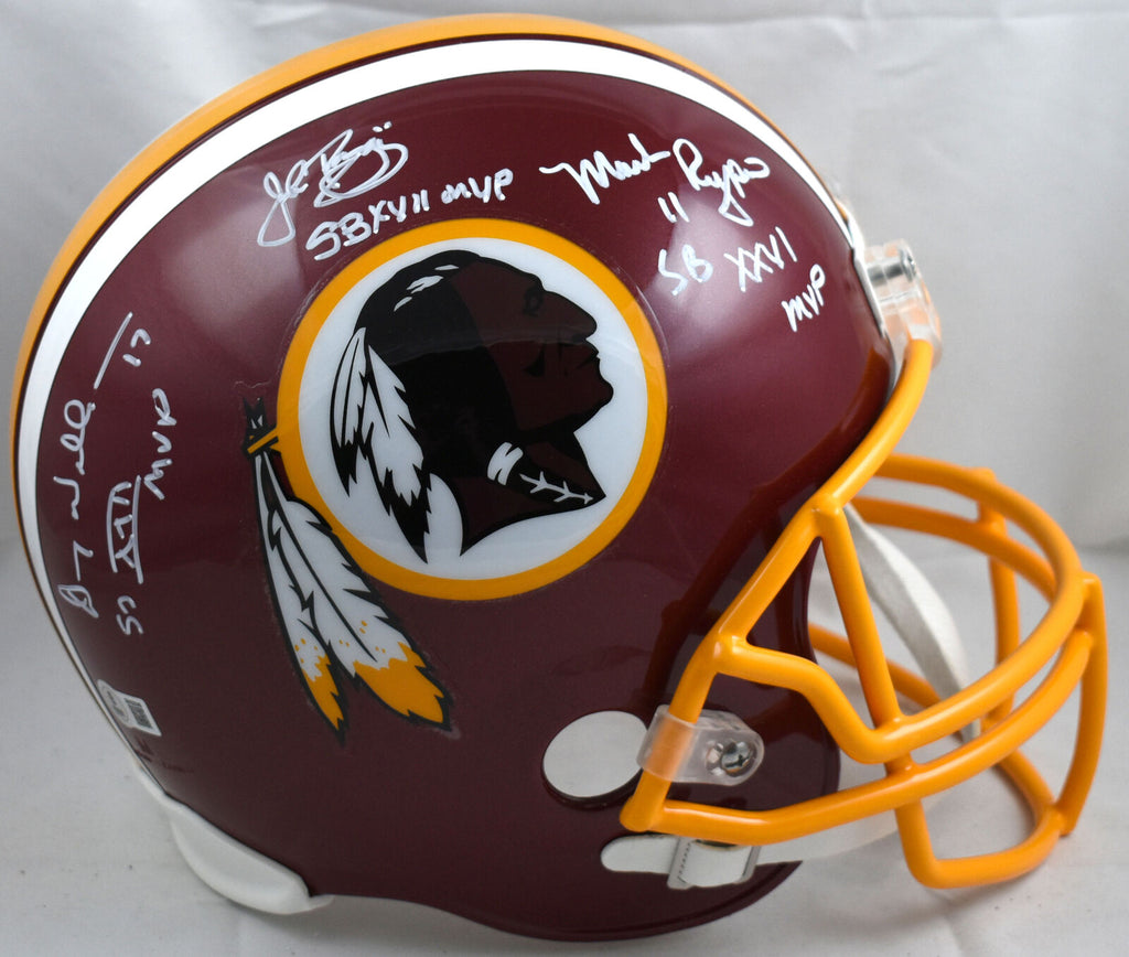 This is a Doug Williams, John Riggins, Mark Rypien of the Washington Redskins Autographed Riddell football full size VSR4 Replica helmet. Inscribed SB MVPs. This item has a Beckett Witnessed Authentication, which comes with a numbered sticker hologram and a QR code for verification. You can view this item on the Beckett Authentication website and it shows when and where the item was signed. It was signed either at a public autograph appearance or a private signing. This is a stock photo of the item. Although you may not receive this exact item, the item you receive is virtually identical, brand new, and in great shape. *Autograph location may vary* This is a Doug Williams, John Riggins, Mark Rypien of the Washington Redskins Autographed Riddell football full size VSR4 Replica helmet. Inscribed SB MVPs. This item has a Beckett Witnessed Authentication, which comes with a numbered sticker hologram and a QR code for verification. You can view this item on the Beckett Authentication website and it shows when and where the item was signed. It was signed either at a public autograph appearance or a private signing. This is a stock photo of the item. Although you may not receive this exact item, the item you receive is virtually identical, brand new, and in great shape. *Autograph location may vary*