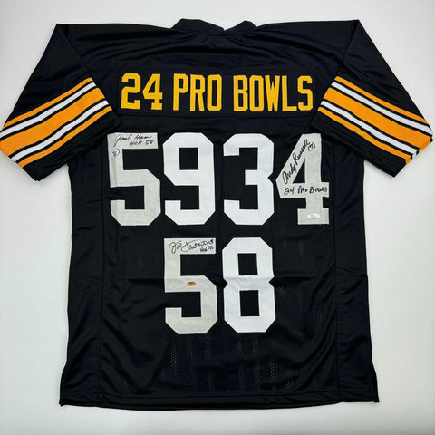 Autographed/Signed Jack Ham, Jack Lambert, and Andy Russell Black Jersey JSA COA