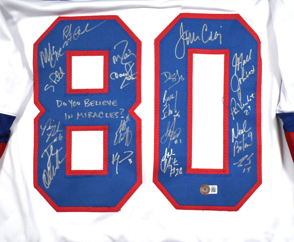 THIS IS NOT AN NHL JERSEY. THIS HAS NO TAGS, NO LOGOS, NO EMBLEMS. This is a Hand Autographed Pro Style Hockey Jersey of Steve Janaszak, Bill Baker, Dave Christian, Ken Morrow, Jack O'Callahan, Mike Ramsey, Neal Broten, Steve Christoff, Mike Eruzione, John Harrington, Mark Johnson, Rob McClanahan, Buzz Schneider, Dave Silk, Eric Strobel, Mark Wells, Craig Patrick & Jim Craig. Inscription reads "Do you Believe in Miracles?" This item has a Beckett Witness Authentication, which comes with a Beckett numbered sticker hologram and a QR code for verification. You can view this item on the Beckett Authentication website and it shows when and where the item was signed. It was signed either at a public autograph appearance or a private signing. This is a stock photo of the item. Although you may THIS IS NOT AN NHL JERSEY. THIS HAS NO TAGS, NO LOGOS, NO EMBLEMS. This is a Hand Autographed Pro Style Hockey Jersey of Steve Janaszak, Bill Baker, Dave Christian, Ken Morrow, Jack O'Callahan, Mike Ramsey, Neal Broten, Steve Christoff, Mike Eruzione, John Harrington, Mark Johnson, Rob McClanahan, Buzz Schneider, Dave Silk, Eric Strobel, Mark Wells, Craig Patrick & Jim Craig. Inscription reads "Do you Believe in Miracles?" This item has a Beckett Witness Authentication, which comes with a Beckett numbered sticker hologram and a QR code for verification. You can view this item on the Beckett Authentication website and it shows when and where the item was signed. It was signed either at a public autograph appearance or a private signing. This is a stock photo of the item. Although you may not receive this exact item, the item you receive is virtually identical and brand new in great shape. Signatures may vary by placement on numbers.