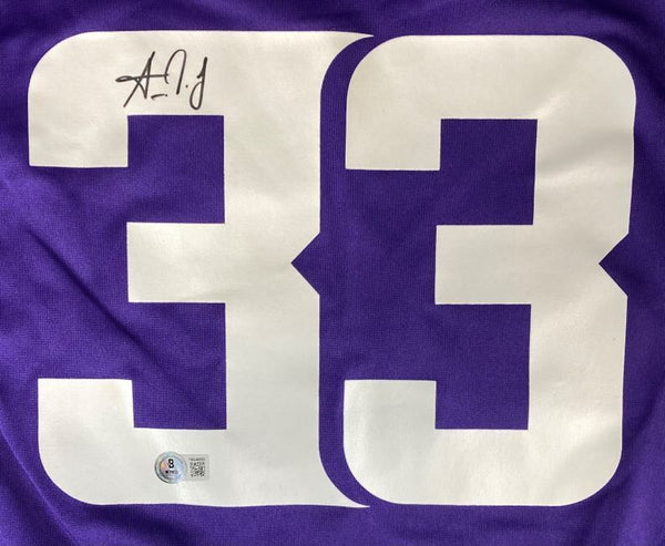 Featured is an Aaron Jones signed Minnesota Vikings Nike game replica football jersey. This jersey has been hand signed by Jones and comes with the Beckett hologram and certificate of authenticity. This jersey is size XL. This jersey would make a great addition to any sports memorabilia collection!. SPECIFICATIONS Autographed By: Aaron Jones Team: Minnesota Vikings Sport: Football Authentication: Beckett Grading Services